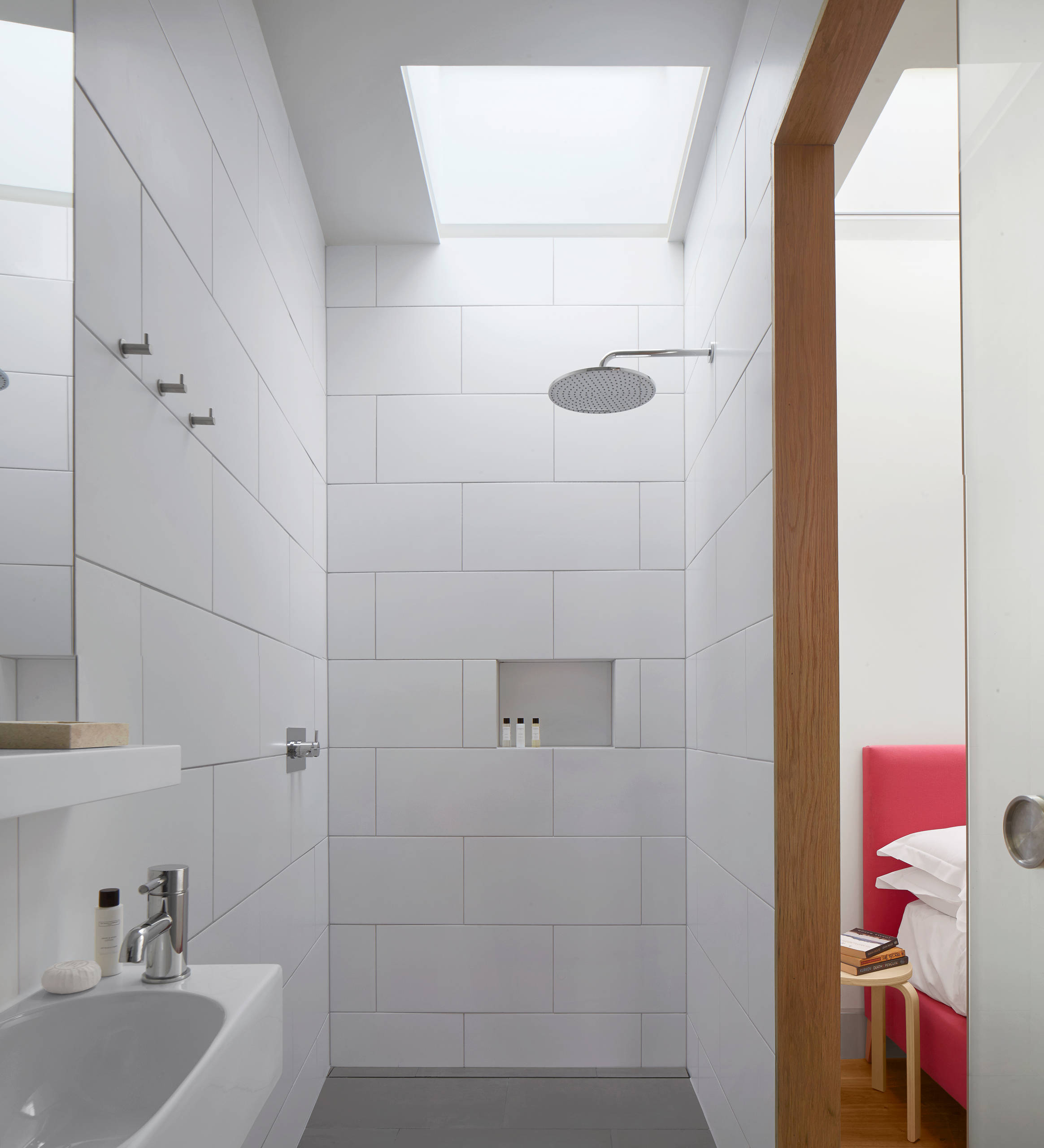Die bäder sind weiß gefliest und mit dunkelgrauen bodenfliesen versehen.